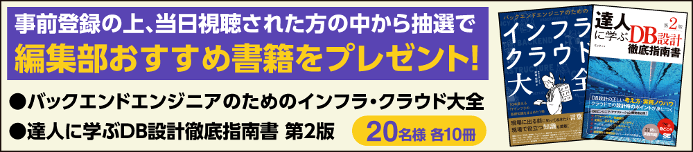 | 抽選でプレゼント | 事前登録のうえ、当日視聴された方の中から抽選で計20名様に、どちらか1冊をプレゼントいたします。 『バックエンドエンジニアのためのインフラ・クラウド大全』 『達人に学ぶDB設計徹底指南書 第2版』 ※発送をもって当選とかえさせていただきます。発送は、12月下旬~1月初旬を予定しております。 |