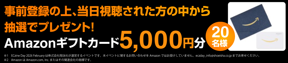 | 抽選でプレゼント | 事前登録のうえ、当日視聴された方の中から抽選でAmazonギフトカードをプレゼントいたします。 ・Amazonギフト券 5,000円分(20名様) ※当選の方には後日メールにてご案内いたします。 |